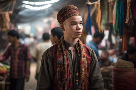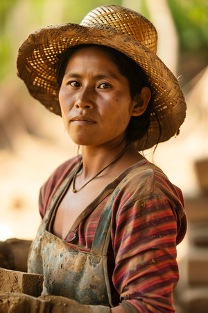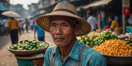 AI Generated. Market vendor man in a broad hat in Yangon, Myanmar