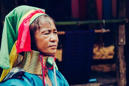 CHIANG MAI, THAILAND - FEBRUARY 01, 2016: Unidentified woman from Karen Long Neck Village near Chiang Mai, Thailand. This village is a part of very popular Hill tribe tourism in Thailand.