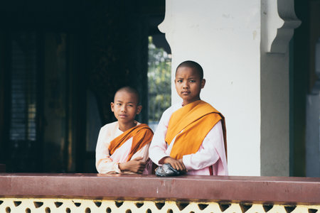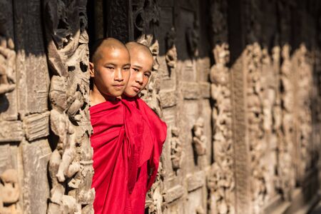 Sagaing/Myanmar-October 2nd 2019: Two novices are standing and smiling happily in a temple.