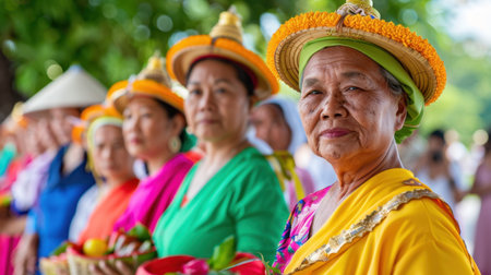 A vibrant scene depicting traditional Asian women in colorful costumes and floral headpieces, celebrating a cultural festival in an outdoor setting.