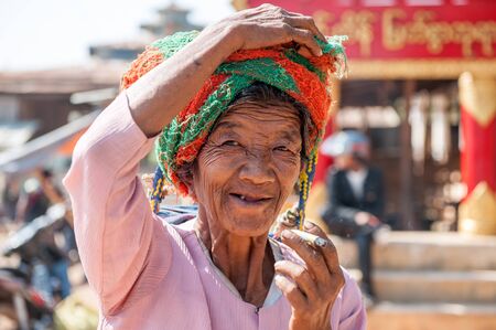 Inle, Myanmar - March 21,2011: An unidentified local Burmese women smoking a cheroot cigar at Morning traditional market every day in the center of famous lake at Inle lake in Inle,Shan state of Myanmar.