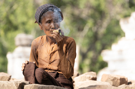 Sagaing/Myanmar-October 3rd 2019: A Burmese elderly woman is smoking a cigarette wrapped with leaves and has tobacco inside.