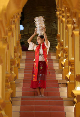 Young girl with traditional Burmese holding bowl of rice on the hand at beautiful golden pagoda in Myanmar