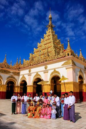 Local people in traditional costumes taking part in wedding ceremony at Mahamuni Pagoda, Mandalay, Myanmar. Mahamuni Pagoda is a Buddhist temple and major pilgrimage site in Myanmar.