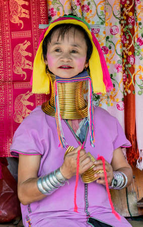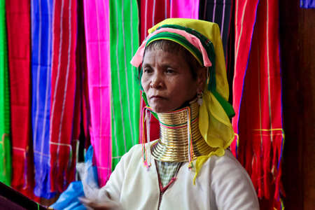 Inle Lake, Myanmar - Nov 09, 2019: Woman of Padaung tribe, Karen long-necked tribe with traditional metal rings around her neck weaving textile scarf