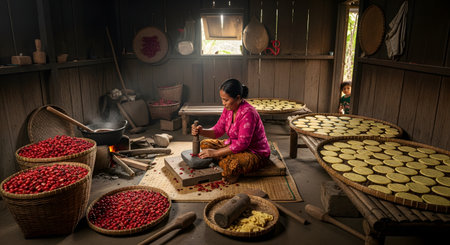 An Indonesian woman in traditional attire works in a rustic wooden kitchen, using a stone grinder to process fresh red coffee cherries. She is surrounded by woven baskets filled with harvested berries and large trays of food drying in the natural light.