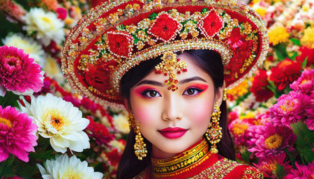 A vibrant scene depicting traditional Asian women in colorful costumes and floral headpieces, celebrating a cultural festival in an outdoor setting.