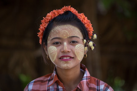 MANDALAY, MYANMAR - JANUARY 17, 2016: Unidentified young Myanmar girl with thanaka on her smile face is happiness. Thanaka is a yellowish-white cosmetic paste made from ground bark.