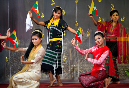 YANGON, MYANMAR - JANUARY 25: Actors performing traditional Burmese dance on evening show in Karaweik Hall on January 25, 2011 in Yangon, Myanmar