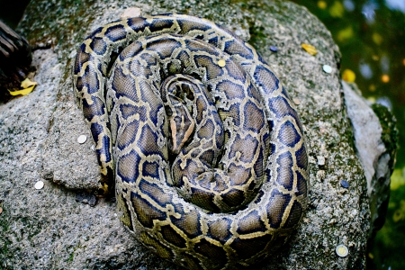 A detailed view of a snake resting on a boulder, showcasing its magnificent scales and unique features, depicting a terrestrial creature from the Colubridae, Python family, and Elapidae group