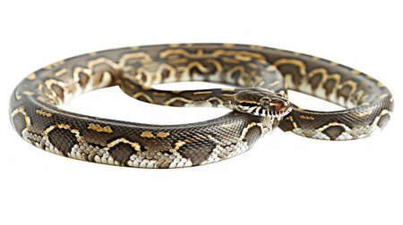 Jamaican Boa displays its elegant coiled posture featuring intricate brown and tan patterns. The soft lighting emphasizes the unique textures and colors of the snake against a pure white backdrop.