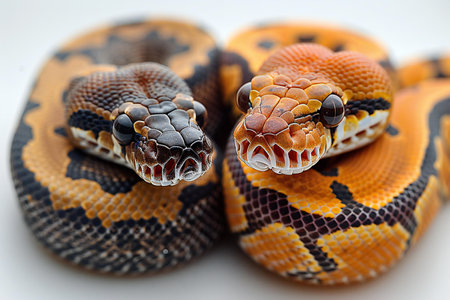 Two brown and black pythons sitting on a white background