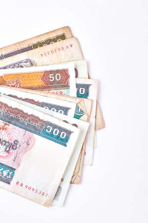 20 Thai Baht bills lies in different order isolated on white. Local banking or money making concept. Business background banner