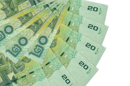 20 Thai Baht bills lies isolated on white background with copy space stacked in fan shape close up. Financial transactions concept