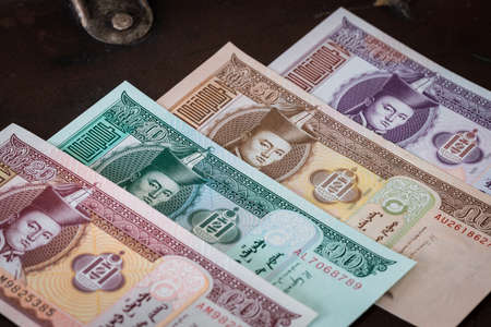 Mongolia currency, Tugrik money, Various banknotes, Place for text