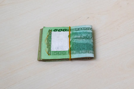 Small bundle of five hundred Bangladeshi Taka banknotes tied with a rubber band on a light wooden surface. Close-up of BDT 500 Tk.