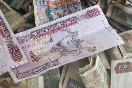 Heap of old Myanmar money. Stacks of Burmese banknotes. Burma currency.