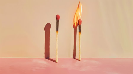 Group of burned matches on beige background, hard shadows, aesthetic, ideas, emotional burnout, teamwork. Generative AI.