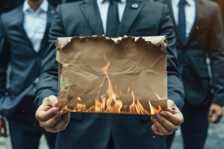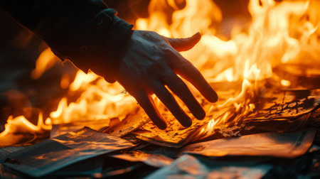 Hand Touching Flames from Burning Financial Documents. AI generated