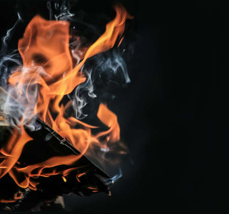 Open burning diary on black background. Notebook with flame coverage. Destruction of business documents concept. Twilight. Outdoors. Defocus, blur, noise, grain effect.