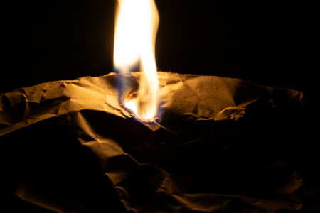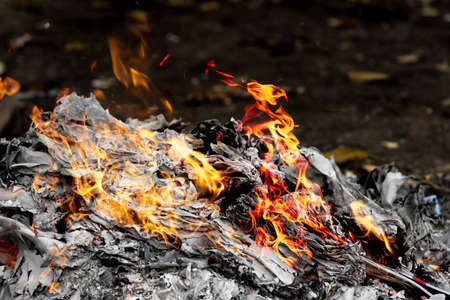 A pile of printed papers ignites fiercely, sending flames upward in an urban setting. The fire creates dynamic movements and intense heat.