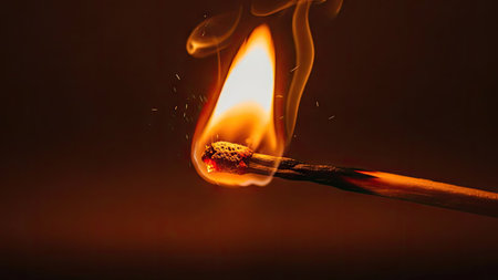 A matchstick burns brightly against a dark background, its flame the central focus. The image showcases warm, orange and yellow hues, with visible smoke and small particles. The composition is close up, highlighting the textures of the match. Suitable for illustrating ideas related to heat, energy, or transformation for various commercial purposes.