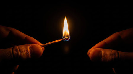 A match ignites, held between hands against a dark backdrop, showcasing a bright flame. The image uses a low-key lighting approach, emphasizing the flame's glow and the texture of the hands. This composition might be suitable for illustrating concepts of energy, starting, or inspiration, ideal for various commercial projects.