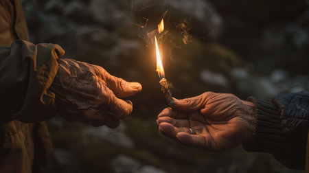 The weathered hands of an elder leader passing a torch to a younger person, symbolizing the transfer of knowledge.