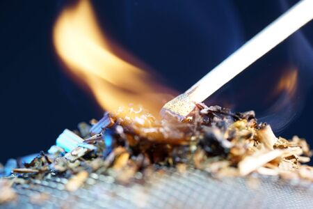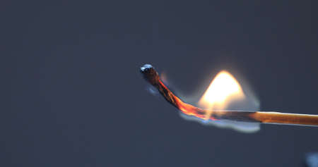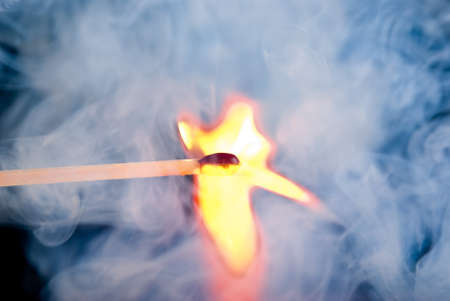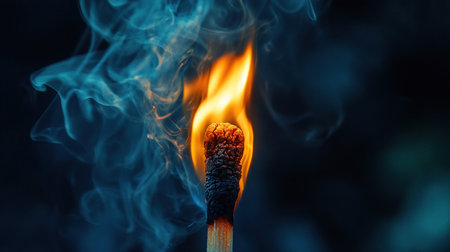 Close-up of a matchstick burning with a bright orange flame and blue smoke, set against a dark backdrop.