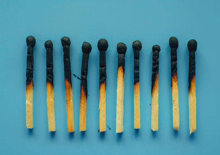 burnt matches arranged on a blue background, close up view of the charred tips, highlighting fire damage and texture, suitable for concepts of destruction, loss, or caution