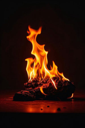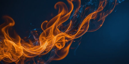 A vibrant orange flame rises against a blurred, dark backdrop with wisps of smoke. The image showcases dynamic movement and contrasts warm colors with cool tones. Suitable for conceptual illustrations, the composition suggests energy, heat, and potential uses in visual media.