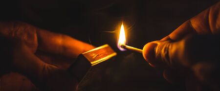 The flame of a small burning match in a womans hands. Woman protects the fire from the wind. Dusk, shooting outdoors. Blur, noise, defocus, grain effect.
