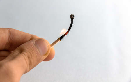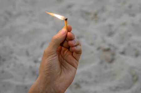 Right hand of adult man. The flame from the match pointing to the up and right.