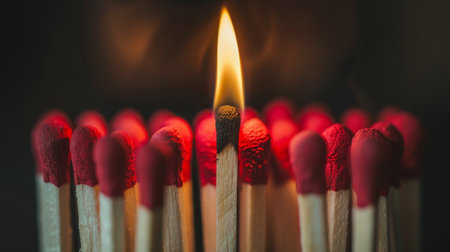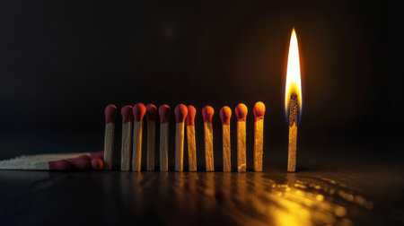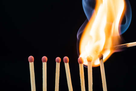 A row of matches with one lit match in the middle. Concept of a single match being able to ignite a whole row of matches