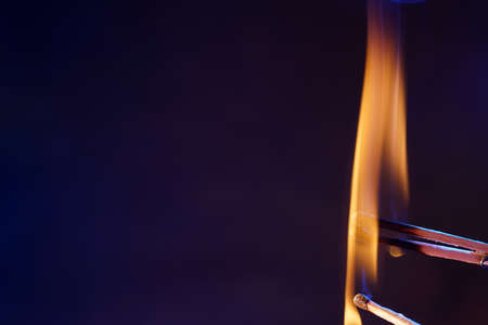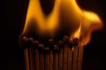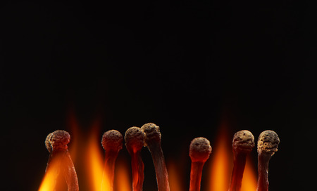 Row of burning matches. Matches burning and illuminating the dark studio space with light and warmth. Macro shot