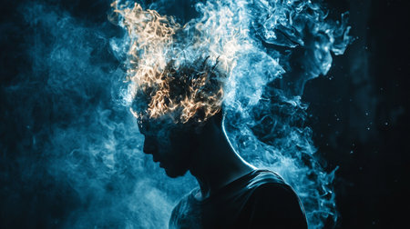 A surreal portrait featuring a head silhouette surrounded by glowing particles and ethereal blue lighting.
