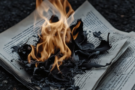 Flames dance upon the charred edges of crumpled paper, an emotional display of destruction. As the fire consumes the remnants of forgotten stories, the air fills with a blend of nostalgia and sorrow, capturing the fleeting nature of knowledge.