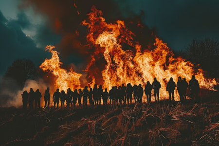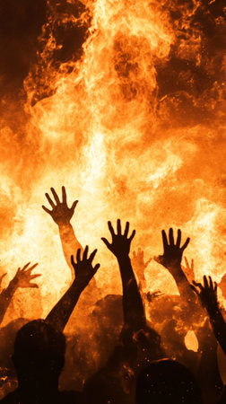 People raising hands in front of towering flames during a vibrant night celebration, generating a dramatic and energetic atmosphere filled with excitement and warmth