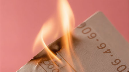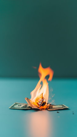 Close-up of dollar bills burning in flames, representing financial loss, economic downturn, and the destruction of wealth and investment