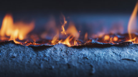 This striking image captures the mesmerizing dance of flames over a charred surface, showcasing the interplay of light and dark in a captivating visual experience.