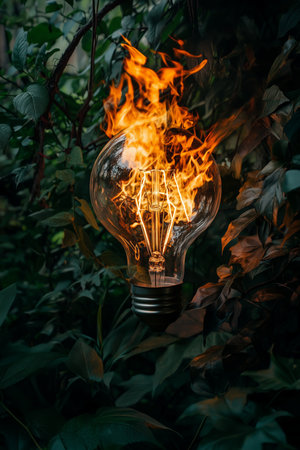 A light bulb engulfed in flames surrounded by lush green foliage.