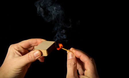 A hand holds a burning match on a black background. A wooden match burns in the hands of a macro. Igniting a match on a box. Smoke from a match. Flash
