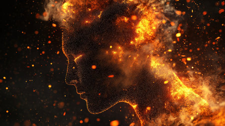 Captivating abstract illustration depicting a human silhouette enveloped in fiery particles and glowing sparks, symbolizing transformation and creative energy.