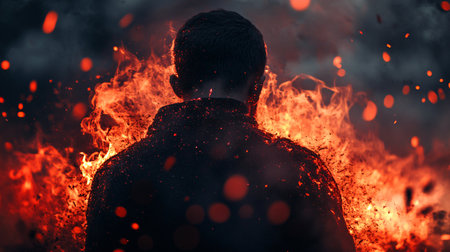 Man is standing in front of a fire with a black jacket on. The fire is very large and the man is surrounded by a lot of sparks. Scene is intense and dramatic