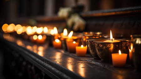 closeup of multiple burning candles with beautiful bokeh in church