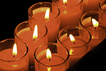 Group of red candles in church for faith resurrection prayer. Candlelight fire flames in rows are silent religion symbol for peace, life and soul. Obituary hope sacrifice against sorrows and pain.