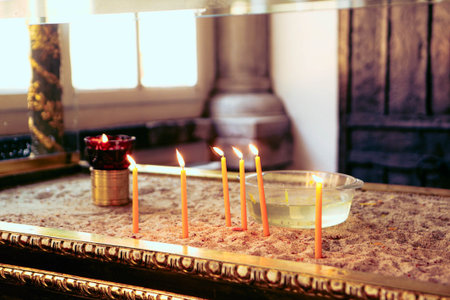 Close up of candles in old catholic church, blurry background