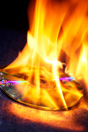 Broken compact disc divided into parts close-up on a red-burgundy background, complete loss of data