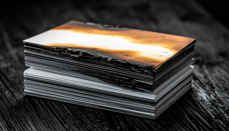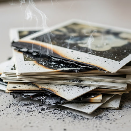 A close-up shot captures the charred and blackened edges of a stack of important documents.