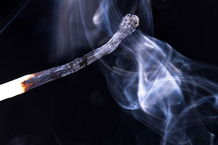 Extinguished match close up with smoke on dark background